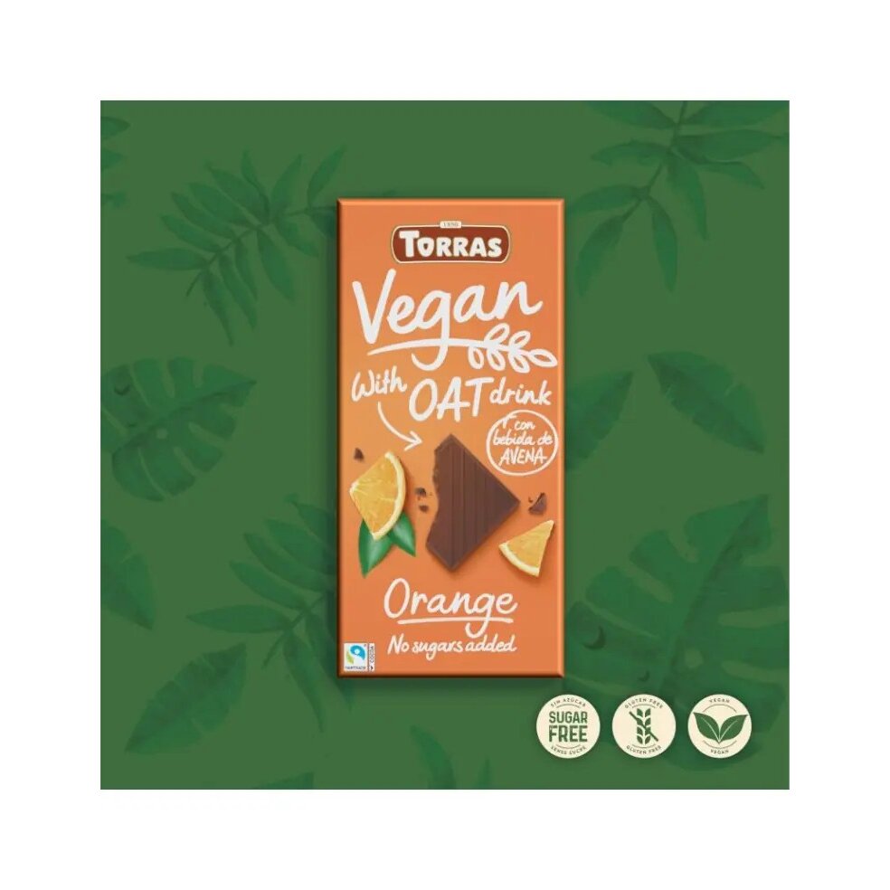 Wegańska czekolada TORRAS z napojem owsianym i pomarańczą, bez dodatku cukru. Idealny wybór dla osób na diecie wegańskiej i diabetyków.