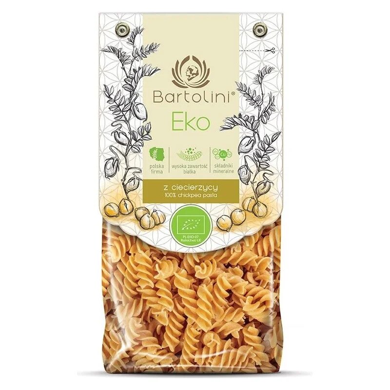 Makaron proteinowy Bartolini to innowacyjny produkt wykonany w 100% z mąki z ciecierzycy pochodzącej z certyfikowanych upraw ekologicznych. Świderki o charakterystycznym kształcie idealnie łączą się z sosami, dostarczając organizmowi wysokiej jakości białko roślinne oraz błonnik pokarmowy.