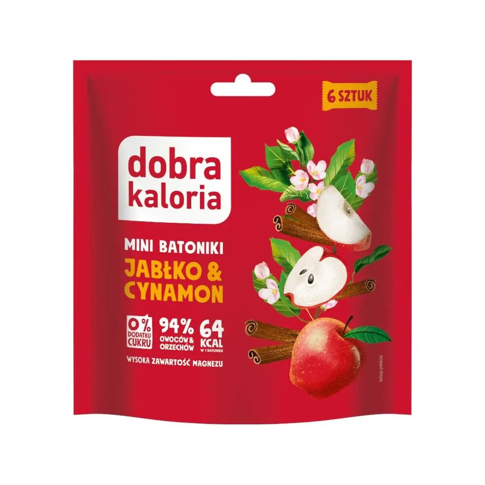 Mini batoniki Jabłko & cynamon DOBRA KALORIA to naturalna i zdrowa przekąska bez dodatku cukru, która łączy aromatyczne jabłko z rozgrzewającym cynamonem. Stworzone z myślą o osobach dbających o linię i zdrowe odżywianie, stanowią doskonałą alternatywę dla tradycyjnych słodyczy.