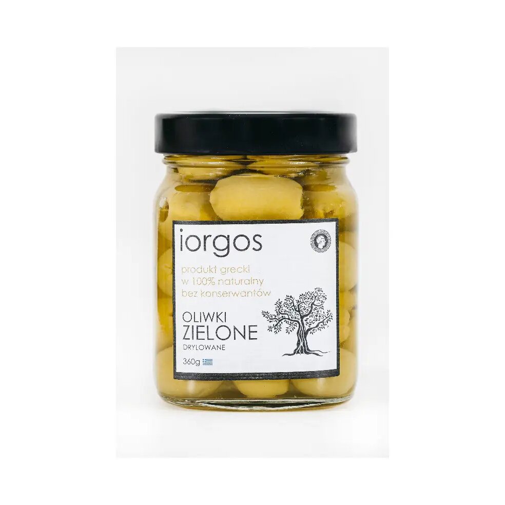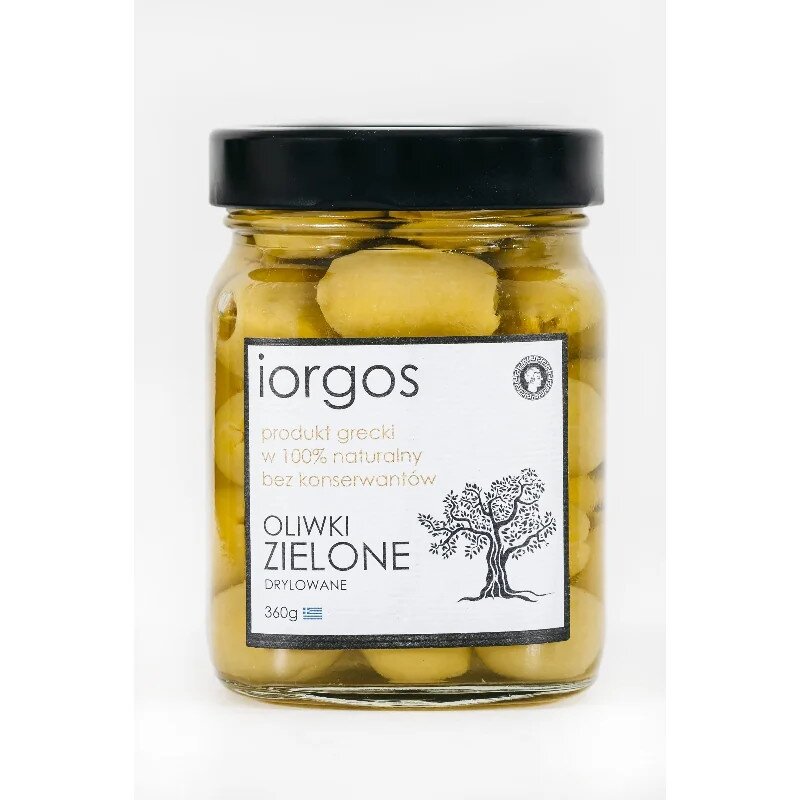 Autentyczne greckie oliwki zielone drylowane IORGOS o intensywnym smaku i mięsistej konsystencji. Idealne do sałatek, przekąsek i dań śródziemnomorskich.