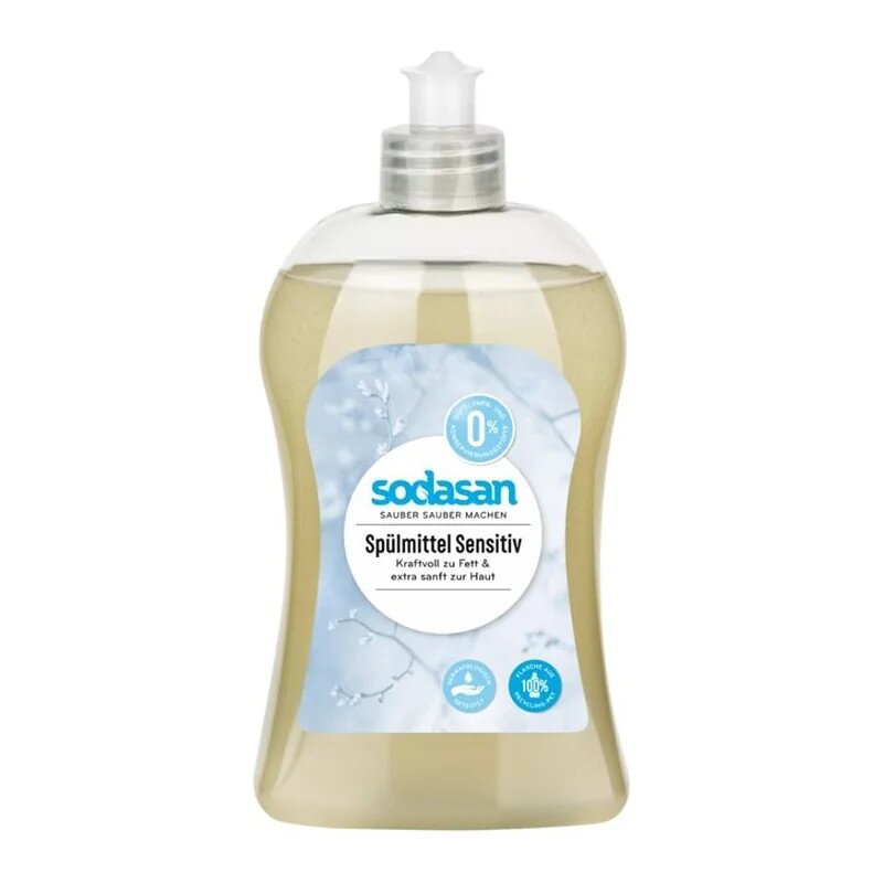 Delikatny płyn do mycia naczyń SODASAN 500ml na bazie naturalnych składników, skutecznie usuwa tłuszcz i brud, jednocześnie chroniąc skórę dłoni.