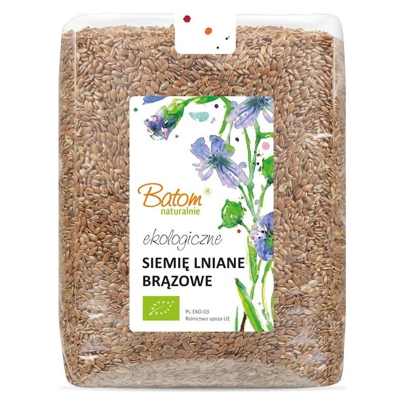 Organiczne siemię lniane brązowe BATOM BIO to naturalne źródło błonnika, kwasów omega-3 i białka roślinnego w wygodnym opakowaniu 1kg.