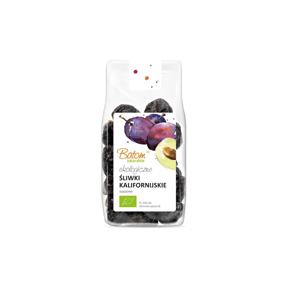 Ekologiczne śliwki kalifornijskie suszone bez pestek BATOM BIO – naturalne źródło błonnika i potasu w wygodnym opakowaniu 250g.