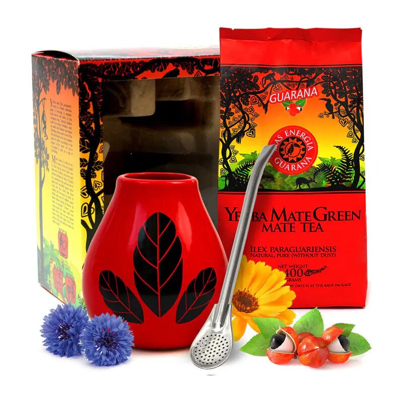 Kompletny zestaw dla miłośników yerba mate zawiera wysokiej jakości herbatę z dodatkiem guarany oraz tradycyjne akcesoria do parzenia. To idealne rozwiązanie dla osób szukających naturalnego źródła energii i chcących poznać autentyczną kulturę picia yerba mate według południowoamerykańskich tradycji.