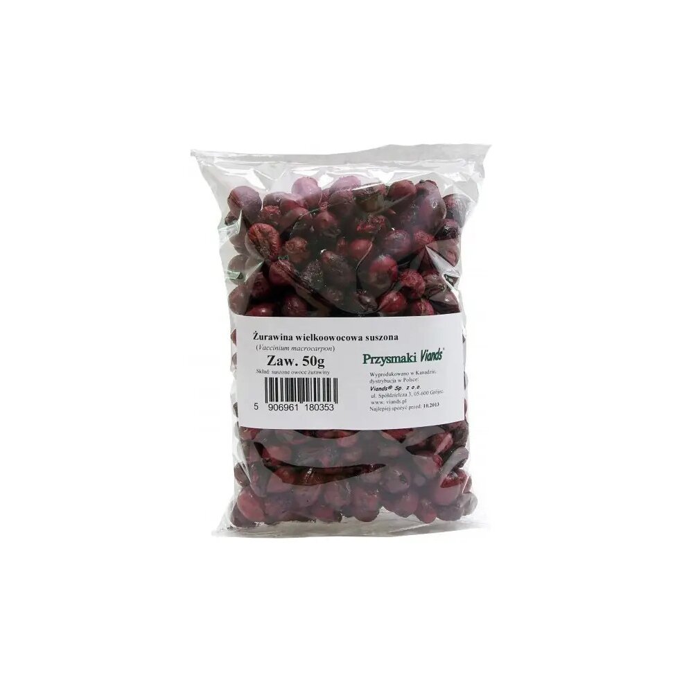 Suszona żurawina wielkoowocowa VIANDS to naturalne źródło witamin i antyoksydantów w wygodnym opakowaniu 50g.